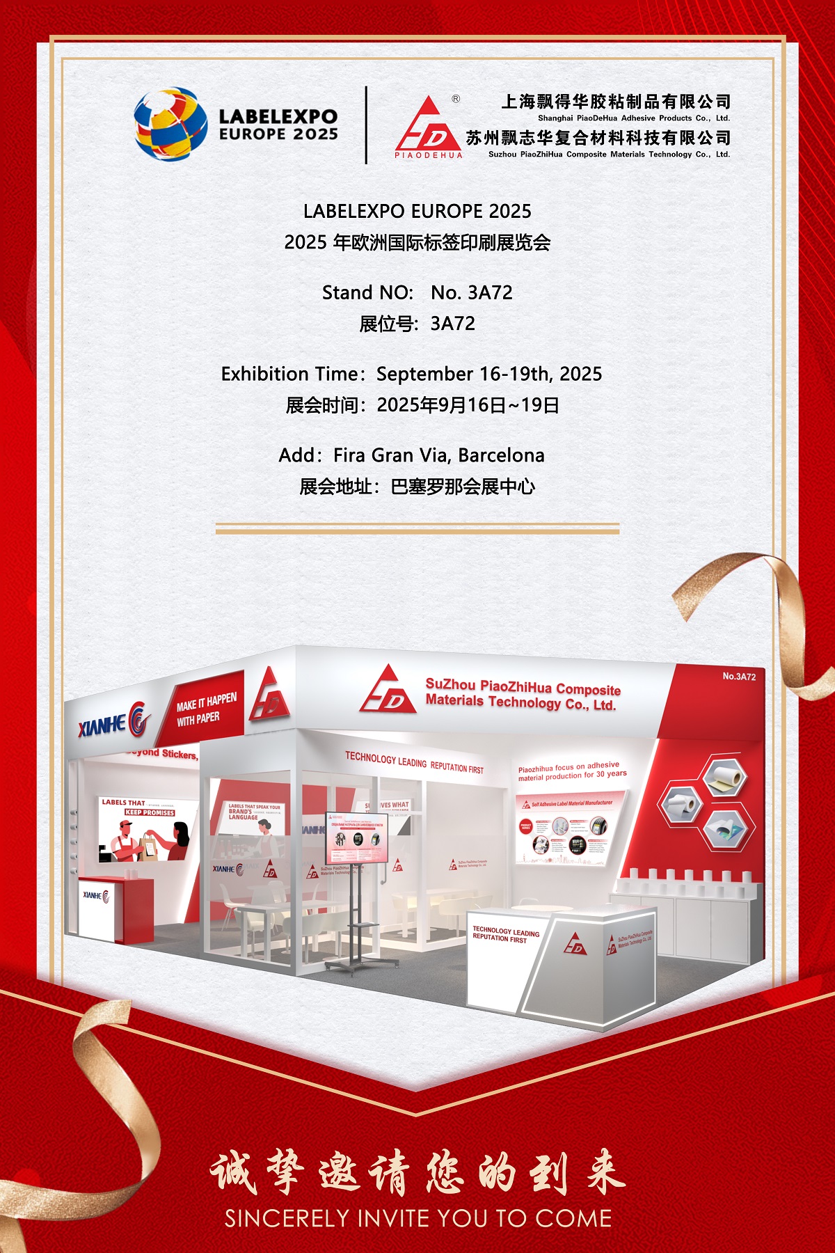 SuZhou PiaoZhiHua Composite Materials Technology Co., Ltd., 16 - 19 Eylül 2025 tarihleri arasında İspanya'nın Barselona kentindeki Fira Gran Via'da gerçekleşecek, etiket ve ambalaj baskısına yönelik önde gelen uluslararası ticaret fuarı Labelexpo Europe 2025'e katıldığını duyurmaktan gurur duyuyor. Otuz yılı aşkın endüstri deneyimine sahip, yüksek performanslı kendinden yapışkanlı etiket malzemelerinin güvenilir bir üreticisi olan Piaozhihua, yenilikçi ürün portföyünü Booth'ta sergileyecek Hayır.3A72 . Sergide tüketim malları, lojistik ve endüstriyel sektörlerdeki çeşitli uygulamalar için özel olarak tasarlanmış gelişmiş yapıştırıcı çözümleri yer alacak.